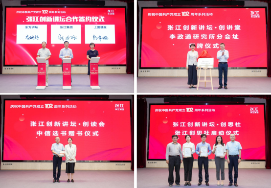 張江創(chuàng)新講壇合作簽約儀式(左上)、李政道研究所分會(huì)址揭牌(右上)、中信選書贈(zèng)書儀式(左下)、張江創(chuàng)思社啟動(dòng)儀式(右下)