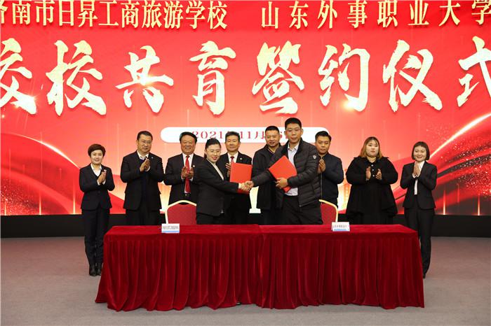 隨后,濟(jì)南市日昇工商旅游學(xué)校執(zhí)行校長管玉川與山東外事職業(yè)大學(xué)產(chǎn)教融合辦公室主任張榮家成功簽署校校共育協(xié)議。