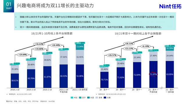 興趣電商將成為雙11增長的主驅(qū)動力 回顧2018年-2021年雙11全域電商增長趨勢可見,2018年-2021年全域電商雙11銷售增長逐步放緩,2021年,不含抖音銷售規(guī)模,僅維持個(gè)位數(shù)增長。