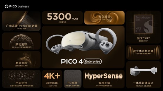 本次新品VR一體機(jī)PICO 4 Enterprise憑借強(qiáng)勁的性能,為用戶帶來更好的視覺體驗和更強(qiáng)的沉浸感。它采用的Pancake光學(xué)方案能夠?qū)崿F(xiàn)105°超廣視野,精彩畫面盡收眼底。同時,其分辨率高達(dá)4320 x 2160的4K+超視感屏,最高可實現(xiàn) 90Hz 刷新率,更有1200 PPI的超清晰畫面表現(xiàn),使呈現(xiàn)在眼前的場景絲毫畢現(xiàn)、栩栩如生,仿佛置身其中。此外,PICO 4 Enterprise還搭載驍龍?XR2芯片,配備256G存儲和8GB DDR5內(nèi)存,使操作更快、更流暢,內(nèi)置的5300mAh大容量電池滿足更長續(xù)航。