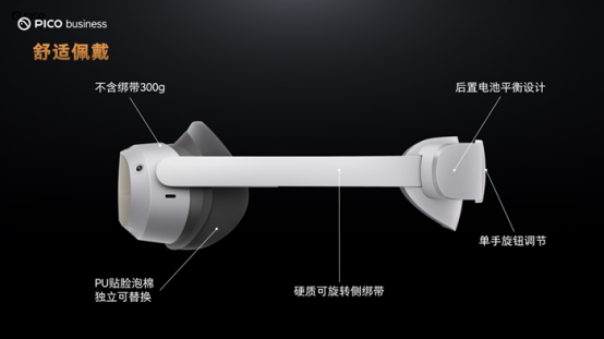 PICO 4 Enterprise采用一體化輕薄機(jī)身設(shè)計,符合人體工學(xué),久戴也舒適。機(jī)身不含綁帶僅重300g,只比一臺常規(guī)的智能手機(jī)重一點,采用后置電池平衡設(shè)計和硬質(zhì)可旋轉(zhuǎn)側(cè)綁帶,支持單手旋鈕調(diào)節(jié),大大優(yōu)化了用戶長時間佩戴的體驗。值得一提的是,PICO 4 Enterprise專為企業(yè)級用戶設(shè)計了獨立可替換的PU貼臉泡棉,相比布料的消費(fèi)者版,更適合多人使用,滿足長時間佩戴的需求。