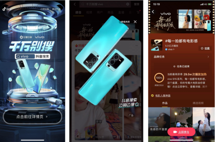例如,在「千萬別搜」第一季中,vivo便通過兼具時尚感與科技感的創(chuàng)意開屏激發(fā)用戶點擊興趣,讓用戶通過點擊一鍵直達(dá)熱點品專并彈出彩蛋承接用戶興趣,進一步聯(lián)動#每一拍都有電影感話題轉(zhuǎn)化經(jīng)營——通過這條完整的路徑,vivo實現(xiàn)話題頁5.3億曝光、全民任務(wù)播放量超穩(wěn)定播放區(qū)間最高值1.8倍的超預(yù)期佳績。