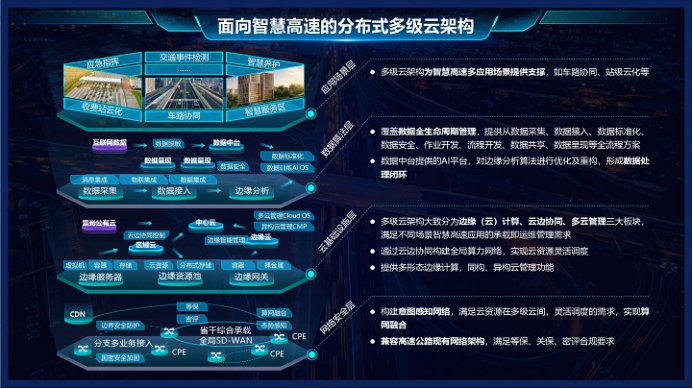 方案采用了分布式多級云架構(gòu),架構(gòu)大致分為邊緣(云)計算、云邊協(xié)同、多云管理三大板塊,通過云邊協(xié)同構(gòu)建全局算力網(wǎng)絡(luò),實現(xiàn)云資源靈活調(diào)度,提供多形態(tài)邊緣計算,同構(gòu)、異構(gòu)云管理功能,為智慧高速多應(yīng)用場景提供支撐。