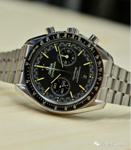 超霸Super Racing的盤面布局,是雙眼計(jì)時(shí)盤,3點(diǎn)位是60分鐘和12小時(shí)計(jì)時(shí)盤 (兩根計(jì)時(shí)指針是同軸的),9點(diǎn)位是小秒針。但凡是歐米茄9系計(jì)時(shí)機(jī)芯,都是這種布局。手表盤面上呈現(xiàn)“蜂巢”結(jié)構(gòu)。