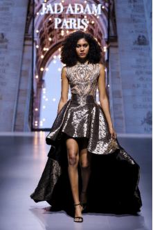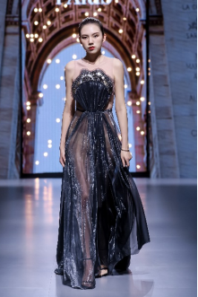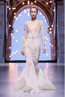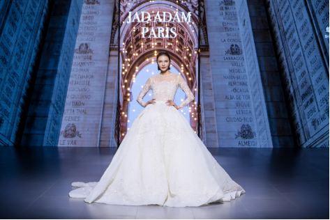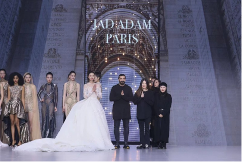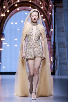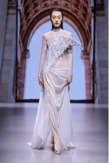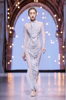 在充滿異域風(fēng)情的“巴爾米拉女王”主題發(fā)布中,法國高定女裝設(shè)計(jì)師JadAdam攜手紹興永耀紡織品有限公司、紹興晶遠(yuǎn)創(chuàng)意設(shè)計(jì)有限公司展現(xiàn)了尋找內(nèi)心平靜的啟蒙之旅的獨(dú)特過程。設(shè)計(jì)師從柯橋優(yōu)秀的面料中獲得啟發(fā),在華麗的禮服裙中采用了大量的刺繡及繡片繡珠工藝。兩家企業(yè)提供的閃光高密度歐根紗、銀色金屬絲、清透網(wǎng)眼等面料,花型立體簡潔、色彩透亮多變,為設(shè)計(jì)師帶來了豐富的靈感。從晚禮服、婚紗到高級時(shí)裝,JadAdam通過特有的藝術(shù)表現(xiàn)手法詮釋了本次禮服設(shè)計(jì)。