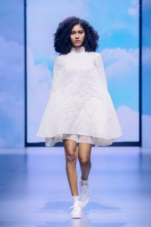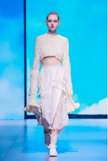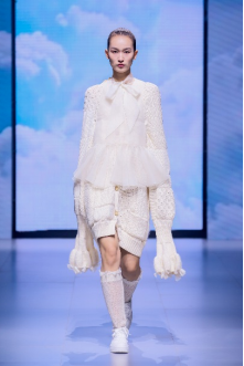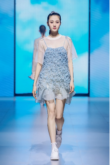 在“童年”主題秀演中,法國設(shè)計(jì)師聯(lián)袂浙江懿紗紡織科技有限公司、紹興柯橋豐旺紡織品有限公司,圍繞兒童的藝術(shù)、回到學(xué)校、童年的回憶三個(gè)子主題,共同演繹了童年的懷舊故事。設(shè)計(jì)師以精細(xì)的絎縫、印染、明線縫紉及自然著色的效果制作服裝和圖案,在工藝上采用了法國特有的編織技術(shù),并結(jié)合WALTZ系列花紗、三醋酸、錦滌歐根紗、六角硬網(wǎng)等面料輕薄有型、色彩飽滿的特色,最大程度實(shí)現(xiàn)了紡織工藝的價(jià)值化。特別是在傳統(tǒng)手工藝非遺、生態(tài)環(huán)保材料等系列元素的加持下,為整場秀演增添了可持續(xù)時(shí)尚的價(jià)值。
