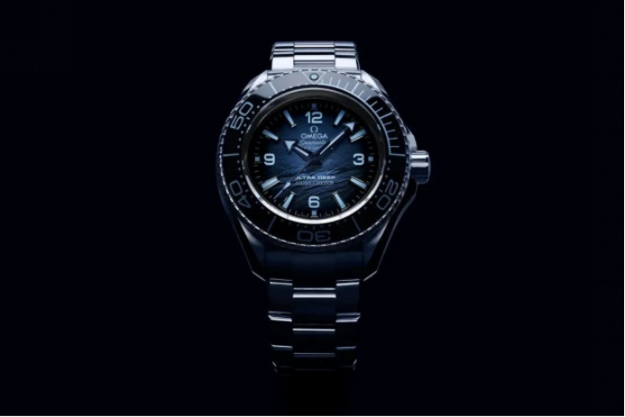 這次歐米茄海馬75周年紀(jì)念款的表盤,雖然每一款的質(zhì)感都不同,卻都采用了漸變藍(lán)色的暈染效果,歐米茄稱之為“Summer Blue”。但是根據(jù)每個(gè)款式所能承載的下潛深度不同,表盤采用的藍(lán)色色調(diào)也不同,基本上對(duì)應(yīng)照光層,弱光層,深海層,深淵層的不同深度下海水呈現(xiàn)的效果。比如6000米已經(jīng)到了海底的深淵層,這個(gè)深度是需要探照燈照明的,那海洋宇宙Ultra Deep 6000M專業(yè)潛水表表盤的藍(lán)也就更加深邃,幾乎接近黑色。