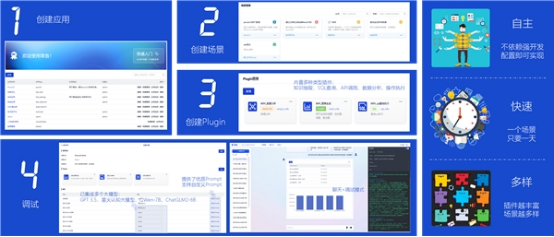 通過智能編排,OctopusX能夠?qū)⒛P头?、業(yè)務功能、數(shù)據(jù)資源等緊密融合,以滿足不同領(lǐng)域、不同場景的需求。無需強開發(fā),用戶通過配置即可快速實現(xiàn)一個基于大模型的AI場景,僅需4步便能快速響應。在業(yè)務場景數(shù)據(jù)條件具備的情況下,一個場景僅1天即可上線。