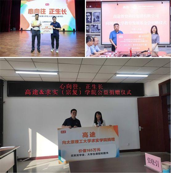 為幫助引導(dǎo)當(dāng)代大學(xué)生樹立正確的學(xué)習(xí)觀和就業(yè)觀,增強(qiáng)職業(yè)生涯規(guī)劃意識(shí),培養(yǎng)創(chuàng)新創(chuàng)業(yè)思維,保持奮發(fā)昂揚(yáng)向上的精神狀態(tài)。6月12日到15日,高途先后向山西師范大學(xué)、太原理工大學(xué)、河南大學(xué)、武漢理工大學(xué)四所大學(xué)捐贈(zèng)了總價(jià)值超過600萬(wàn)元的課程書和書籍,支持在校大學(xué)生學(xué)習(xí)提升。同時(shí)高途在山西師范大學(xué)、太原理工大學(xué)設(shè)立了連續(xù)三年的“獎(jiǎng)教獎(jiǎng)學(xué)金”,用于獎(jiǎng)勵(lì)有突出貢獻(xiàn)的教學(xué)項(xiàng)目和表現(xiàn)優(yōu)異的在校大學(xué)生。